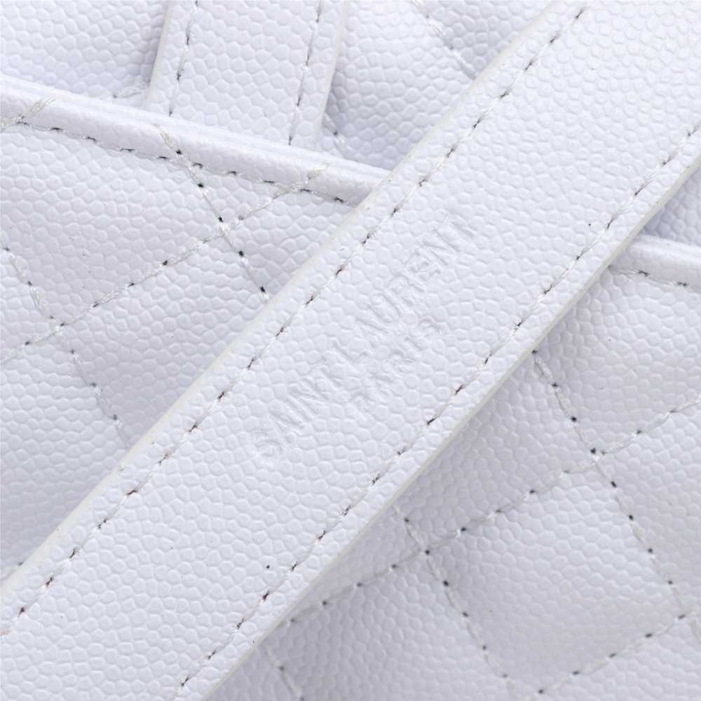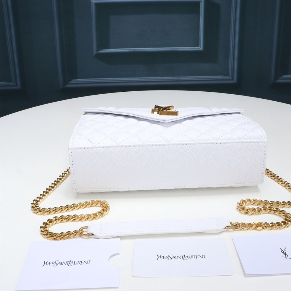 The Saint Laurent Envelope Small Bag in White is a timeless piece crafted from lambskin, showcasing exquisite vertical, chevron, and diamond quilted topstitching. Measuring 21cm, this versatile bag features bronze-toned hardware and a sliding leather-and-chain strap for two stylish carrying options. The luxurious grosgrain lining adds a refined touch, making it perfect for any occasion.