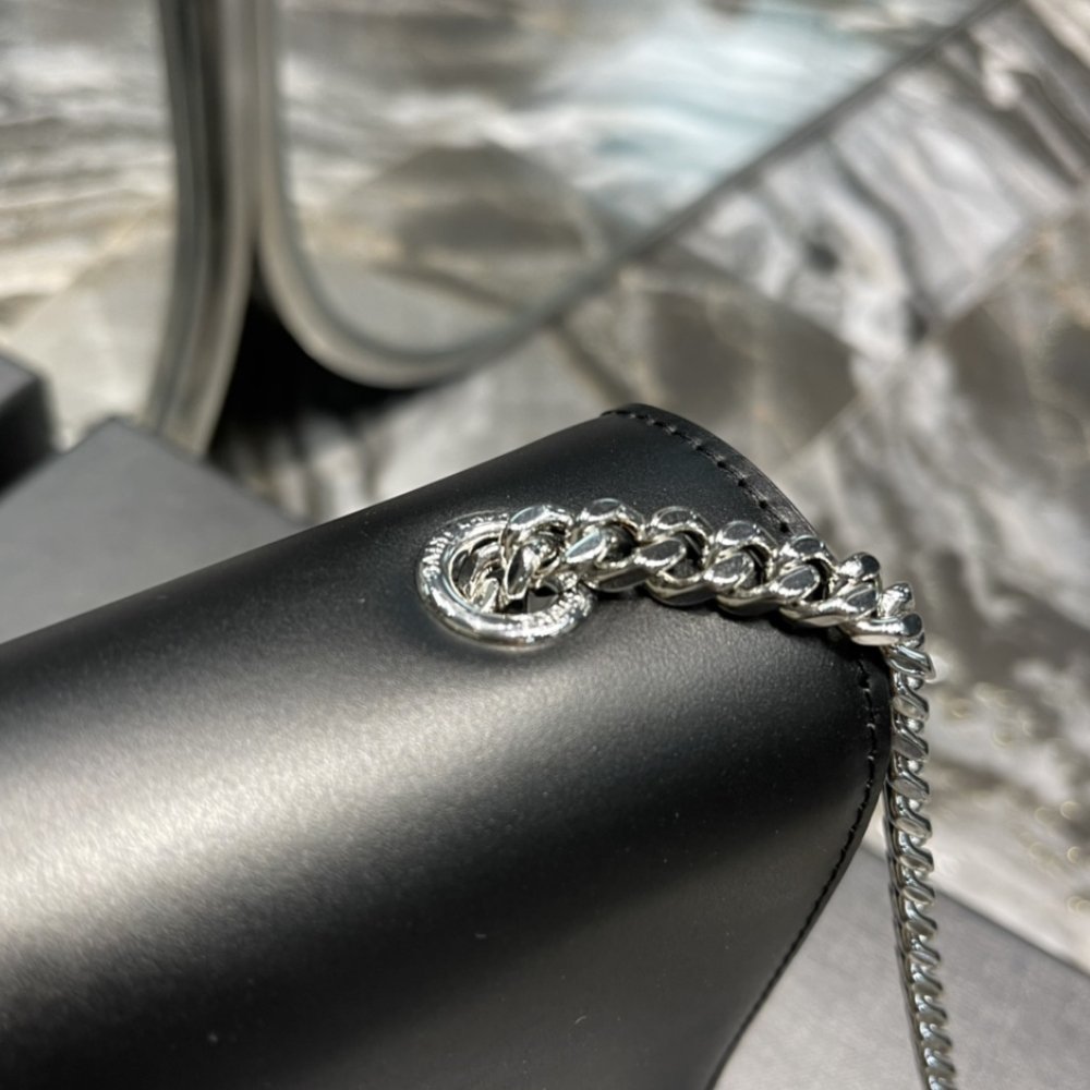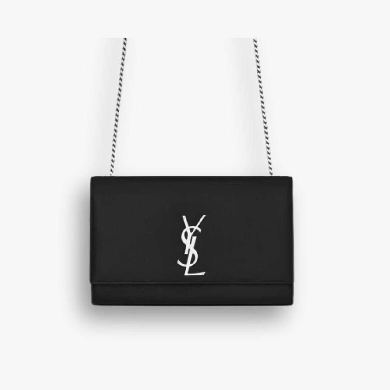 The Saint Laurent Kate Medium in Grain De Poudre Mirror Effect Black (24cm) is an iconic bag featuring the CASSANDRE logo and a curb-link chain strap. Designed for shoulder or crossbody wear, it exudes sophistication with its mirror-effect hardware. Crafted from chrome and metal-free tanned leather, it also boasts organic cotton lining for a sustainable yet luxurious finish.