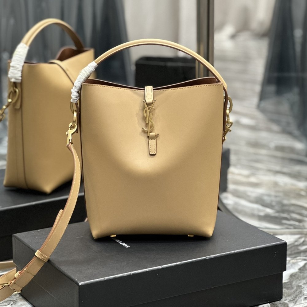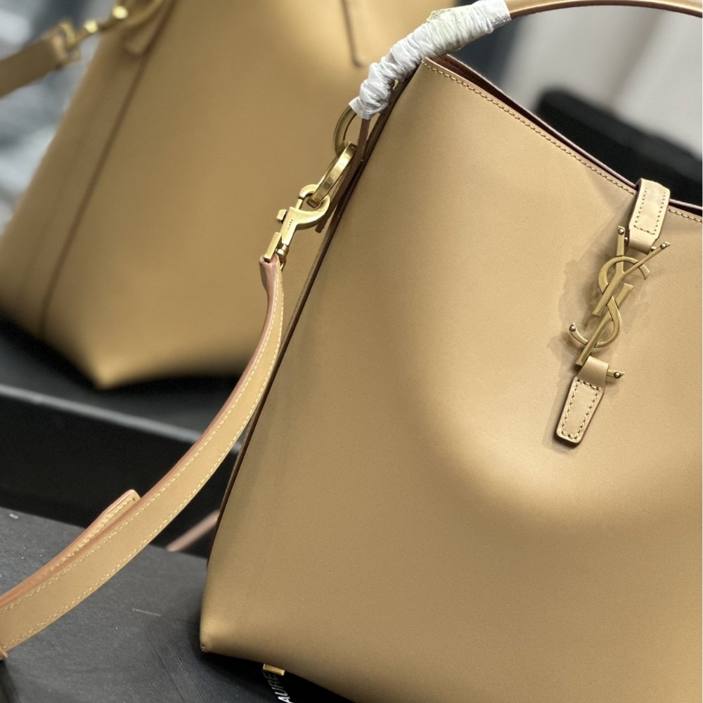 The Saint Laurent Le 37 Bucket Bag in Beige is a stunning blend of elegance and modern flair, featuring light bronze-toned metal hardware for a chic accent. Its 26cm size is perfectly designed for effortless day-to-night transitions. A versatile accessory that adds a touch of sophistication to any outfit.