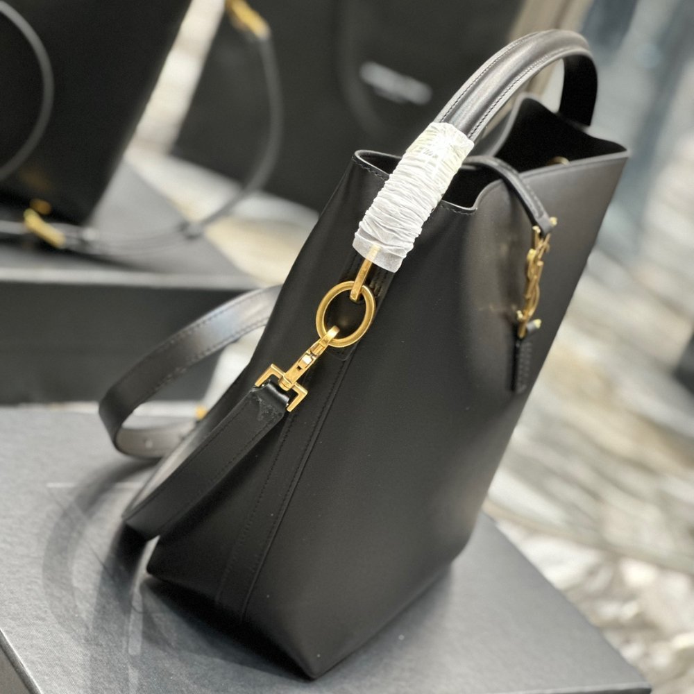 The Saint Laurent Le 37 Bucket Bag in Black is a striking fusion of elegance and practicality, featuring the iconic Cassandre hook closure for a touch of sophistication. Its 26cm design is complemented by a sleek top handle and an adjustable, detachable shoulder strap for versatile styling options. A must-have accessory that effortlessly elevates any outfit with modern charm.