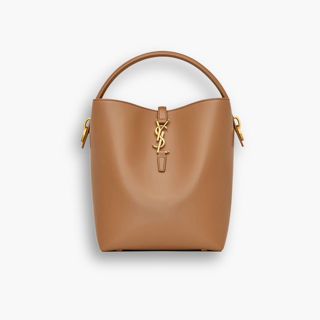 The Saint Laurent Le 37 Bucket Bag in rich Brown exudes sophistication and versatility, highlighted by the iconic Cassandre hook closure that adds a luxurious touch. Its compact 26cm silhouette is perfect for everyday elegance, complete with a stylish top handle and an adjustable, detachable shoulder strap. A timeless accessory that seamlessly elevates any ensemble with its warm, earthy tones.