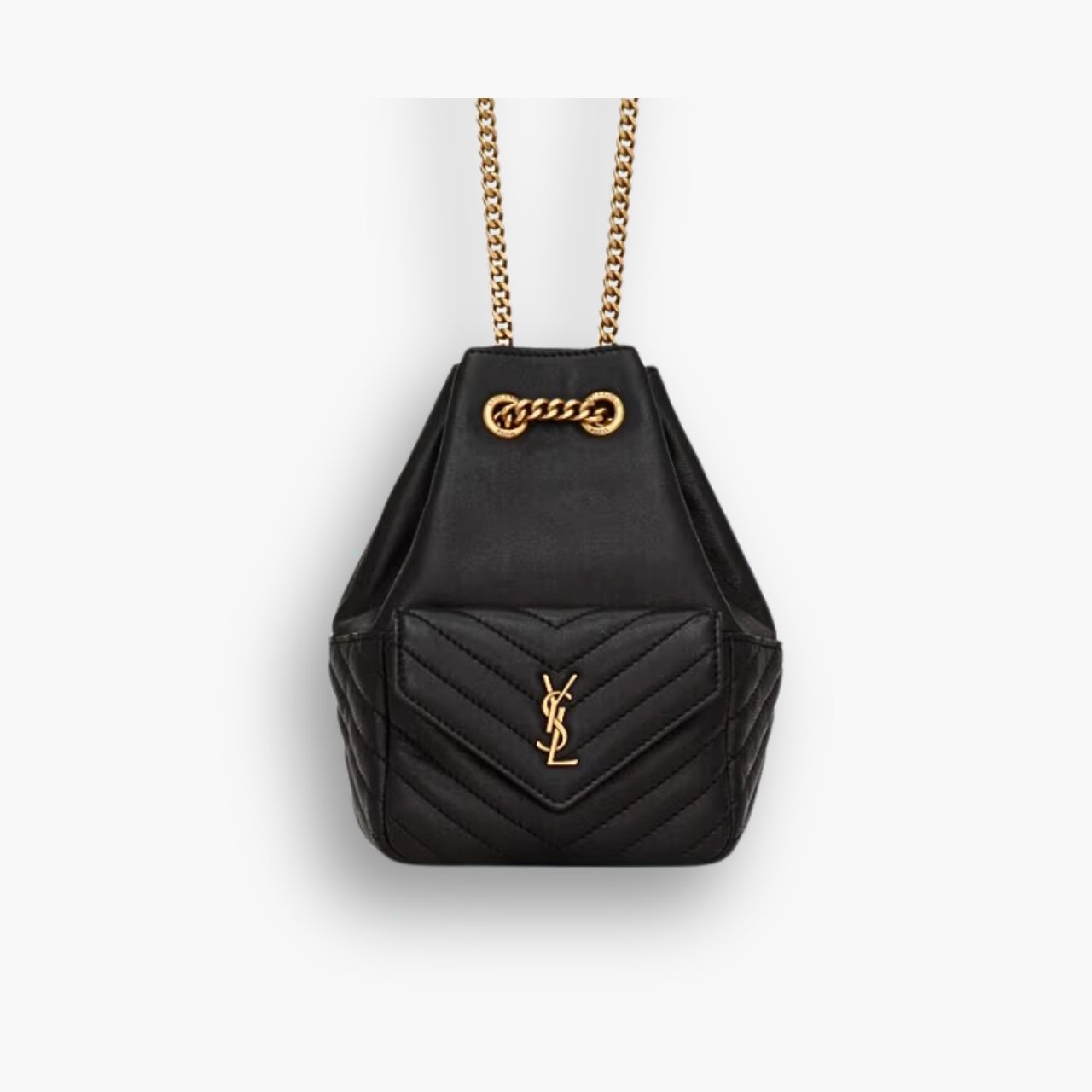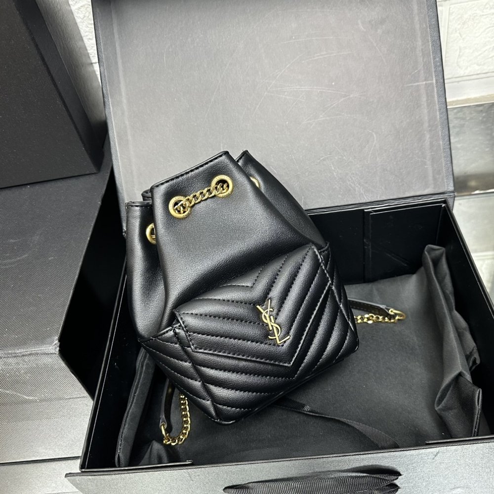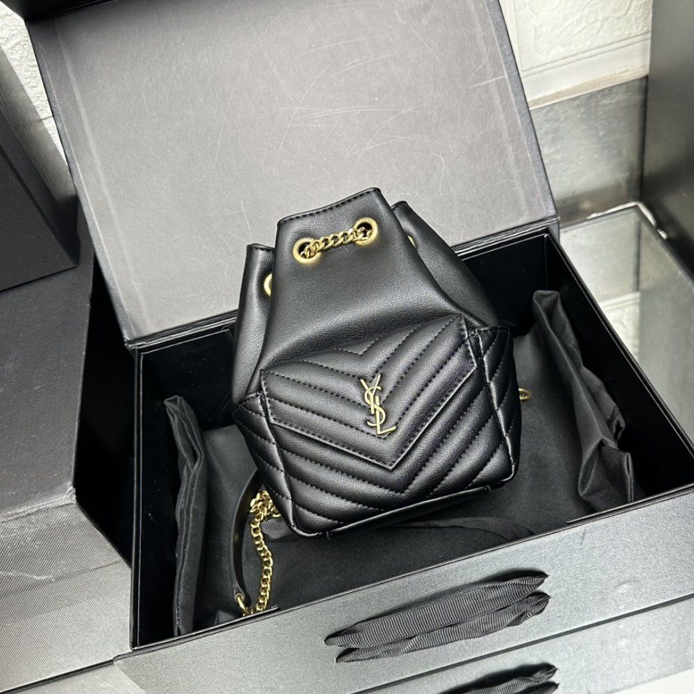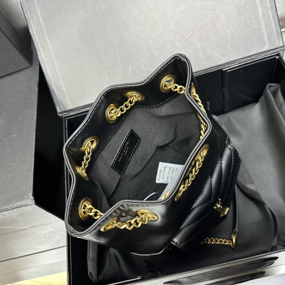 The Saint Laurent Mini Joe in Lambskin Black is a chic mini bucket bag that showcases exquisite quilted chevron stitching adorned with the iconic Cassandre. Compact and stylish, it combines elegance with practicality, featuring a luxurious grosgrain lining. This versatile piece is perfect for elevating any outfit with a touch of sophistication.