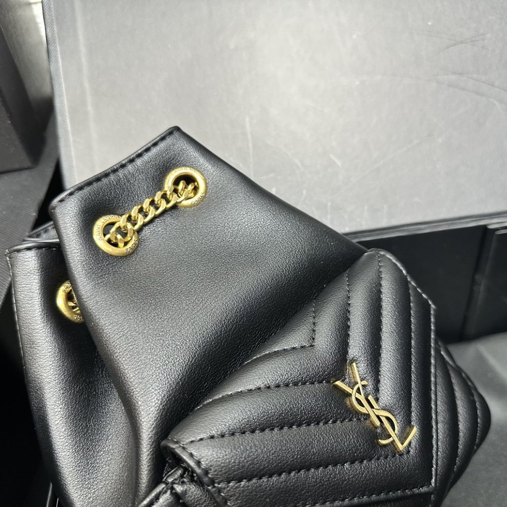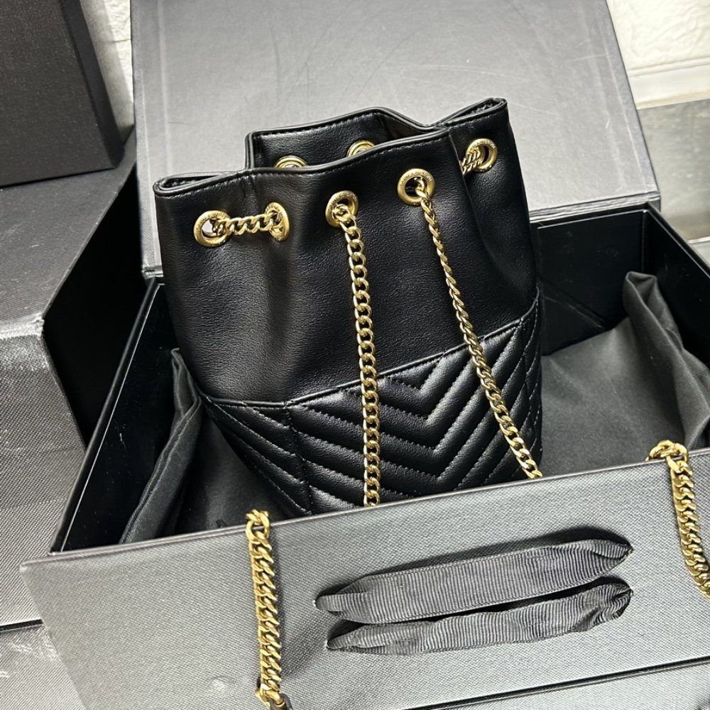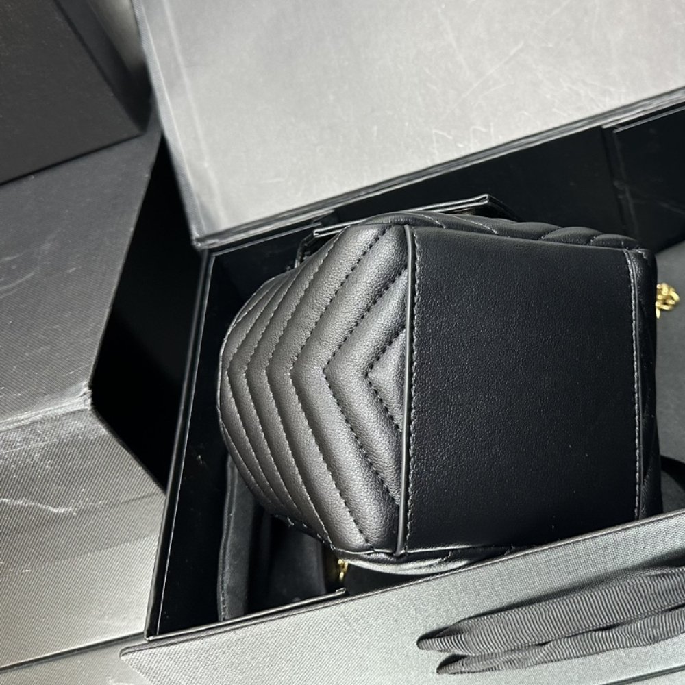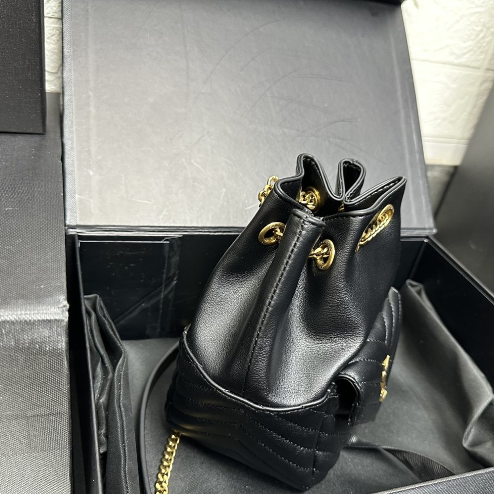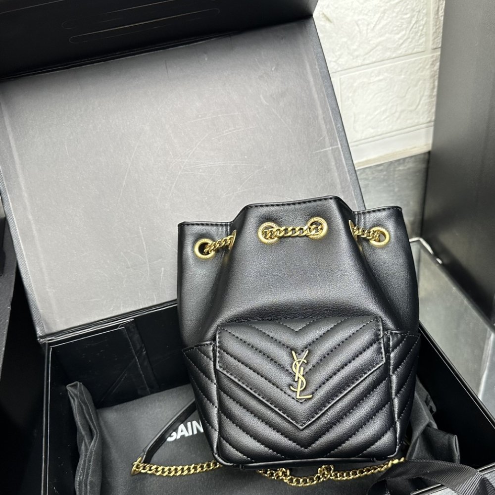 The Saint Laurent Mini Joe in Lambskin Black is a chic mini bucket bag that showcases exquisite quilted chevron stitching adorned with the iconic Cassandre. Compact and stylish, it combines elegance with practicality, featuring a luxurious grosgrain lining. This versatile piece is perfect for elevating any outfit with a touch of sophistication.