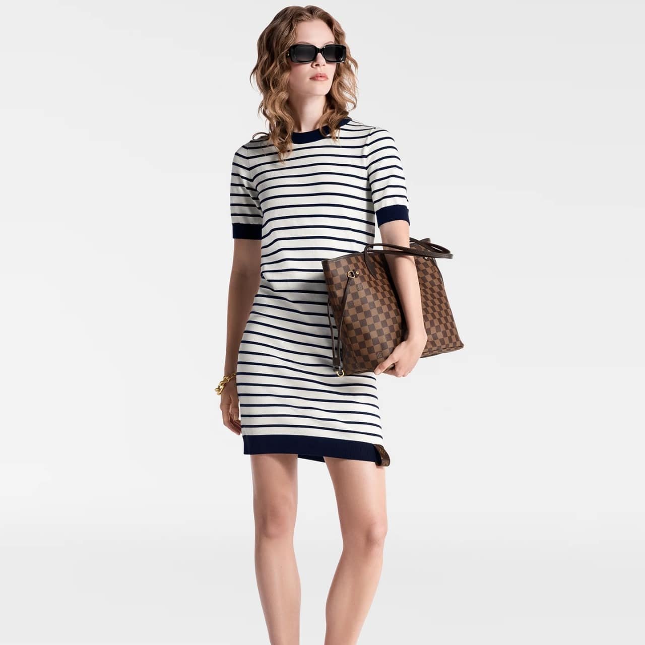 The Neverfull MM tote unites timeless design with heritage details. Elegant in Damier Ebene canvas, it is roomy but not bulky, with side laces that cinch for a sleek allure or loosen for a casual look. Slim, comfortable handles slip easily over the shoulder or arm.