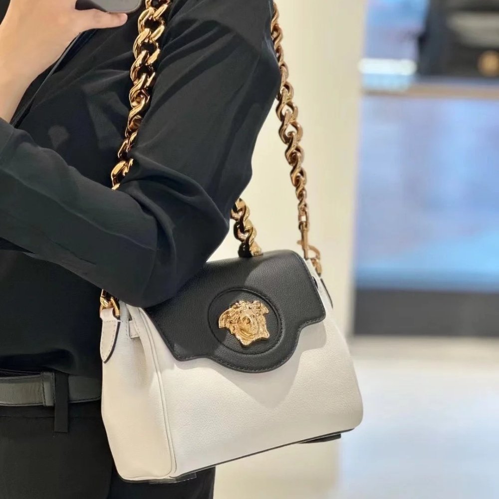 The signature shoulder bag is adorned by a Medusa plaque and chain top handle. The versatile style can be carried in-hand or worn crossbody using the interchangeable chain and leather shoulder straps.
